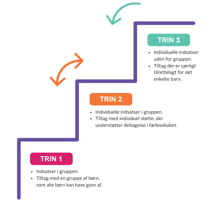 Tretrinsmodellen tydeliggør, hvad vi retter vores indsatser mod. Da Nest i dagtilbud er en forbyggende indsats, sigtes der mod indsatser på trin 1.